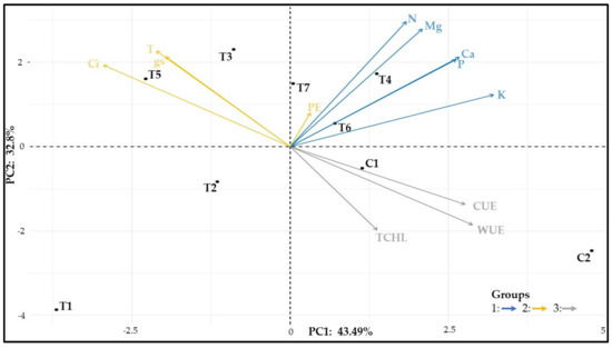 A principal component analysis (PCA) on the correlation matrix was performed to check the correlations among the measured variables. The following variables were included in this analysis: morphological variables: crown diameter (day 15), leaf area, number of leaves, root length, shoot fresh and dry weights, root fresh and dry weights, and total fresh and dry weights; physiological variables: internal CO2 concentration, leaf transpiration, stomatal conductance, photosynthetic efficiency, water use efficiency, carboxylation efficiency, foliar nitrogen, phosphorus, potassium, calcium, magnesium, and total chlorophylls. The variables had their measures standardized by subtracting the mean and dividing by the standard deviation, thus resulting in the mean of the standardized variables being equal to 0 and the standard deviation equal to 1. The correlation matrix was built from that, and the graphs were finally plotted with the first two principal components.