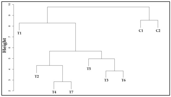 The similarity of the treatments was verified. For this purpose, a dendrogram was prepared gathering the average of all variables analyzed in the study. The grouping was performed using the Euclidean distance combined with Ward’s method for minimum variances.