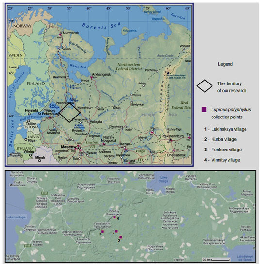 The aim of the study was to evaluate the invasion activity of L. polyphyllus within the Veps Forest Nature Park and to determine its molecular-genetic and biochemical characteristics initiated by microevolution processes over the course of the expansion of its secondary distribution range. To interpret the data obtained, the aim of the study also includes a comparison of intraspecific variability between the “old” invasive populations and the “new” naturalizing population of L. polyphyllus.