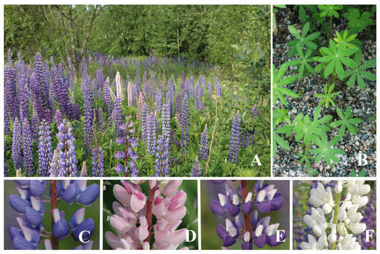 Over the last few years, the secondary range of Lupinus polyphyllus Lindl. within Leningrad Oblast has been expanding [12]. L. polyphyllus (Fabaceae) is an herbaceous biennial or short-lived perennial of North American origin. The native range of the garden lupine lies within western North America: Canada (British Columbia) and the USA (Alaska, Washington, Oregon, and California) [13]. In 1826, L. polyphyllus Lindl. Was brought to England by the famous Scottish “plant hunter” David Douglas and soon became widely cultivated in Central Europe as an ornamental plant [14]. As early as the 1840s, nurseries and botanical gardens offered some color variations of this species. They were described in the rank of forms: L. polyphyllus f. roseus Voss, L. polyphyllus f. tricolor Voss, L. polyphyllus f. albus (Regel) Voss, and L. polyphyllus f. atropurpureus Voss [15]. From 1935–1937, the garden hybrid L. × regalis Bergmans = L. agboreus Sims. × L. polyphyllus, which is characterized by a branched stem with dense inflorescences, blue, purple, pink, white, and even yellowish or orange colorations were recorded. Some articles attribute wild European populations of L. polyphyllus with a variety of flower colors to this hybrid. However, our previous studies have shown that there is no reason for this [16].