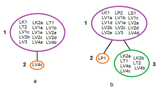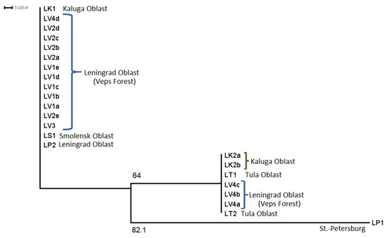 The haplotype network based on the analysis of rpl32–trnL fragments is formed by three haplotypes (Figure 4b) that are very similar to one another. Haplotype 1 is represented by most of the specimens from Leningrad Oblast (most specimens from the Veps Forest and a specimen collected in 1993 without an exact locality specified), one from Smolensk Oblast, and one from Kaluga Oblast; haplotype 2 is represented by a single specimen from St. Petersburg; and haplotype 3 is represented by the remaining specimens from the Veps Forest, two specimens from Kaluga Oblast, and specimens from Tula. The specimen representing haplotype 2 did not fall into either of the two clades reconstructed using the UPGMA analysis.