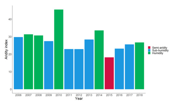 Thermo-pluviometric regimes of the study-site according to the De Martonne-Gottmann aridity (yearly values).