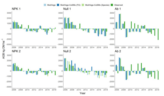 Annual anomalies of aboveground biomass (AGB), observed and simulated with alternative modelling solutions in three treatments (NPK: fertilised; Null: unfertilised; Ab: abandoned) and two blocks (1, 2). Annual mean values of AGB: NPK 1: 2895 kg DM ha−1; NPK 2: 2477 kg DM ha−1; Null 1: 1417 kg DM ha−1; Null 2: 1197 kg DM ha−1; Ab 1: 5245 kg DM ha−1; Ab 2: 4683 kg DM ha−1.