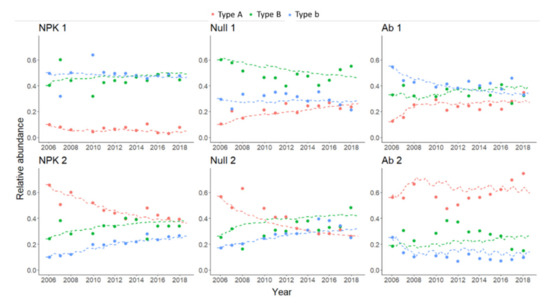 Observed (dots) and ModVege-CoSMo simulated (lines) fluctuations in the relative abundance of plant (grass) functional types in three treatments (NPK: fertilised; Null: unfertilised; Ab: abandoned) and two blocks (1, 2). Type A: grass species of fertile environments, small, with early phenology and a short life span of the leaves; Type B: grass species of fertile environments, larger, with moderately early phenology and a longer leaf life than type A; Type b: grass species preferring relatively fertile environments but differing from the two previous groups in their late phenology. Graphs of the individual plant (grass) functional types are in (Supplementary Material Figures S6–S10).