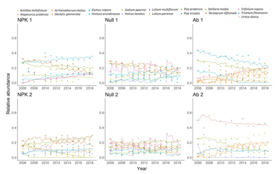 Observed (dots) and ModVege-CoSMo simulated (lines) fluctuations in the relative abundance of plant species in three treatments (NPK: fertilised; Null: unfertilised; Ab: abandoned) and two blocks (1, 2). Graphs of the individual plant species are in (Supplementary Material Figures S11–S16).