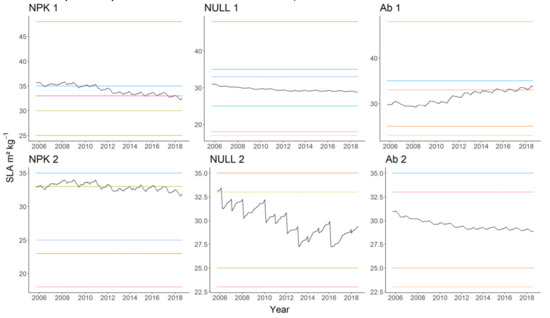 Daily changes in the specific leaf area (SLA) of the community during the simulation period compared to the fixed values set for the plant species (coloured lines as in Figure 4) present in the community (horizontal lines, overlapping for the same values) for three treatments (NPK: fertilised; Null: unfertilised; Ab: abandoned) and two blocks (1, 2).