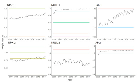Daily changes in the maximum height of the community during the simulation period compared to the fixed values set for the plant species (coloured lines as in Figure 4) present in the community (horizontal lines, overlapping for the same values) for three treatments (NPK: fertilised; Null: unfertilised; Ab: abandoned) and two blocks (1, 2).