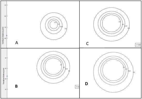 Soil water distribution with the application of 3000 cm3 of non-evaporative infiltration from subsurface drip irrigation: (A) 0.500, (B) 1000, (C) 2000 cm3/hour and (D) 3000 (isolines of soil water contents are marked inside).