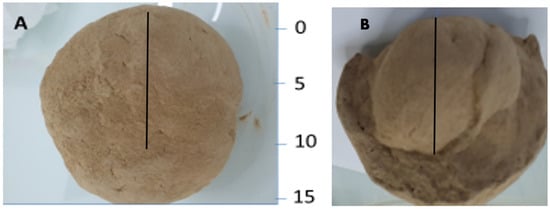 In Table 4, the radius of the ponded zone is calculated by measuring the distance from the center of the sphere (i.e., 42.5 cm) to its saturated isoline. Taking into account all variables in Table 4 (r, s, and v), the average difference between the two modeling approaches of SDI was only 9% (without lowest discharge). The excavated sphere (Figure 5A,B) resulted from the SDI irrigation of clay loam displayed at the saturated zone an “ideal” sphere, but beyond it, in Figure 4 and Figure 5B, a set of unsaturated isolines displays reduced water content. It is assumed that the belt around the central saturated sphere of Figure 5B resulted from the lower water content of the isolines around it, and the gravity effect created isolines with an egg shape below it.