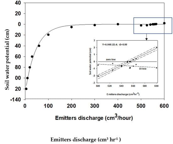 The internal figure within Figure 6 shows that for specific soil properties (Panoche clay loam with Ks = 4.2 ), the soil water potential is zero when the emitter discharge is 560 , and it is positive (around 2 cm) at a discharge of 600 . Thus, in this situation, the build-up of pressure in the soil may reduce or even prevent water outlet away from the emitter. Shani et al. [] measured this back-pressure and showed that it result in a substantial decrease in emitter discharge, especially if the soil has low conductivity, and for non-compensating emitters. Warrick and Shani [] showed the significant deviation of the actual discharge from designed discharge. In their study, it was reduced to 0.905, 0.825, and 0.704 for designed discharges of 1, 2, and 4 L/h, respectively. Ben-Asher [] provided complementary conclusions regarding the pressure build-up phenomena by emphasizing its practical implications. First, there is a potential for elimination of pressure-compensating emitters, because the variability of soil hydraulic properties creates a self-compensating environment. Second, each emitter may have individual flow rates according to its soil properties, and thus allow for longer laterals. Third, the decrease in emitter discharge due to the hydrostatic pressure opposing the the water pressure inside the emitter theoretically enables the use of emitters with a greater orifice, consequently enabling a greater flow rate and reduced orifice-clogging.