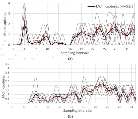 Seasonal flight patterns of H. armigera (black line) as observed with eight pheromone traps (dashed lines) placed in four experimental dry bean fields in the Prespa region of Northern Greece. Sampling intervals are 3-day observations starting from mid-April till end of August 2021 (a) and 2022 (b).