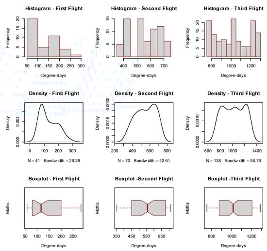 The description of moth capture data distribution frequencies, densities and quartiles for the first, second and third moth flight of H. armigera are shown in Figure 2. Despite the relatively large, for insects, data sets of all three flights were characterized by slight deviations from normality as it shown by the histograms, the density of moth captures as well as the relative boxplots.