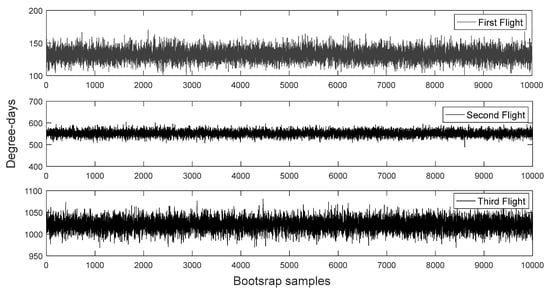 Simulation of a sample of n = 10,000 bootstrapped means,, of random samples taken with replication from the vector of moth phenology for the first, second and third flight of H. armigera.