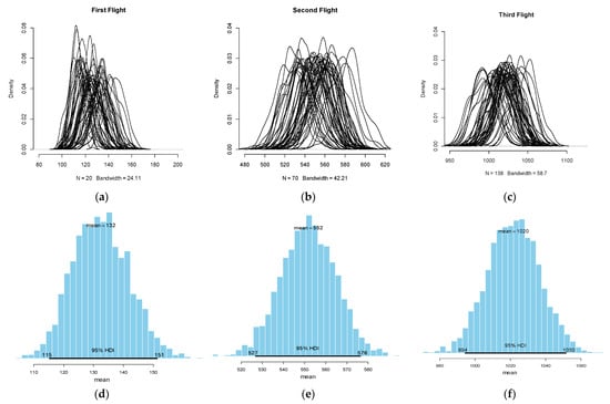 Some simulated bootstrapped densities (n = 50), for the first (a), second (b) and third (c) flight generations of H. armigera. Posterior frequency distributions according to the Bayesian bootstrap procedure (n = 10,000) for the first (d), second (e) and third flight (f) of H. armigera. Means represent the degree-days of the highest pest activity (i.e., peak in moth abundance) and HDI the related 95% high density intervals.