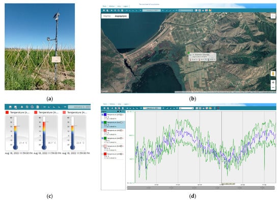 A representative meteorological station (a) and its location in the Prespa lake area in the prefecture of Florina (b). Graphical User Interface (GUI) and real time software outputs of: mean, max and min temperature online sensor indications (c), mean (blue), max and min (green) daily temperature recordings (1 January 2021 so far) (d), pest risk thresholds indications and their duration for the first flight of H. armigera (e) and accumulated degree-days from 1 January 2021 (f).