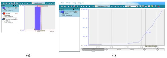Figure 7a illustrates one of the meteorological weather stations (station code: deuterevon1) that were installed in the bean cultivation area of interest over the Prespa lakes in the prefecture of Florina. Figure 7b shows the location of the weather station based on the graphical user interface (GUI) of the digital plant protection decision support system. Figure 7c,d show the temperature indications and the respective heat summation recordings as illustrated in the graphical interface of the decision support system. Thus, overall, the implemented digital plant protection decision support system provides a variable information including the geolocation of the station through a google maps application, information of the weather sensors functioning as well as the illustration of real time weather recording i.e., mean, max and min temperatures, duration of risk thresholds and related accumulated degree-days) (Figure 7e,f). We have set as Biofix for heat recoding and related degree-days heat summation, the 1st of January. Temperature recordings that are higher than 9.42 °C, which is the lower developmental threshold of H. armigera, have been mostly recorded after the end of March for 2021 and the start of April for 2022.