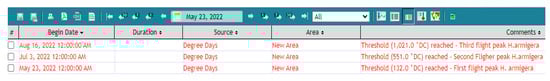 GUI event list output and the real time H. armigera thermal risk thresholds generated by Adcon® telemetry software plant protection decision support system used in the current study. Note that the default software output of 1,021.0 DC corresponds to 1021 accumulated DDs and so on.
