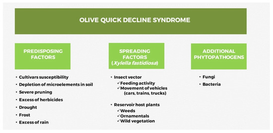 Synoptic panel that illustrates the predisposing factors, spreading factors, and occurrence of additional phytopathogens all involved in possibly causing the “olive quick decline syndrome” in Salento (Apulia, Italy).