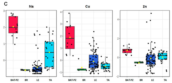 Box plot for the discriminant microelements sodium (Na), copper (Cu), and zinc (Zn) as obtained for olive leaf samples obtained from olive groves of the non-infected area BAT - PZ (BAT: Barletta—Andria—Trani and PZ: Potenza provinces) and from olive groves of the infected areas: BR (province of Brindisi), LE (province of Lecce), and TA (province of Taranto). C: panel C from the figure reproduced from [82].