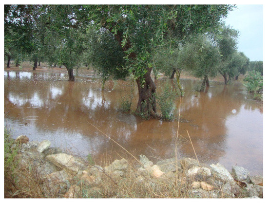 Waterlogging in an olive grove of Salento due to a relative excess of precipitation occurring over a short time. This situation occurs quite frequently in recent years due to climate change. Prolonged anaerobic conditions in the soil can occur, causing deleterious effects to the root system of the trees.