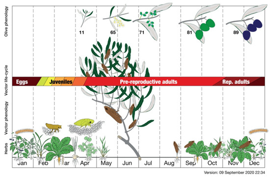 Philaenus spumarius life cycle related to herb and olive tree phenology. Olive phenology numbers refer to the phenological phases of olive: 11: first leaves completely separated; 65: full flowering, at least 50% of flowers open; 71: fruit size about 10% of the final size; 81: beginning of fruit coloring. 89: harvest maturity. (Reproduced from [103]).