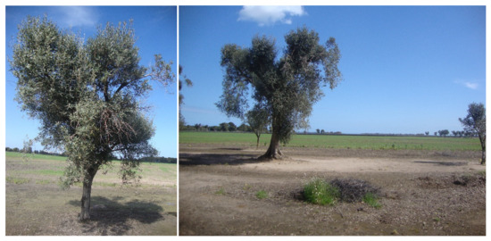 In addition, for new plantations aimed at substituting old olive groves destroyed by OQDS, a failure in rooting during the first year has been observed, probably due to the water demand of young plants that, due to repeated droughts and a lack of irrigation, is not satisfied (Figure 12).