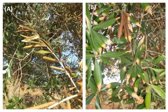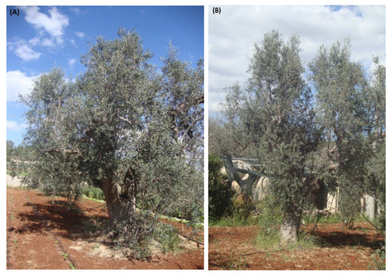 However, further field surveys revealed that the cultivars regarded as “resistant” showed symptoms of OQDS, such that the term “tolerant” seems to be more appropriate for both Leccino and FS-17®, indicating “significantly reduced symptoms when compared with Ogliarola salentina and Cellina di Nardò, and a lower number of bacterial cells in infected tissue” [129,130]. A decline in adult Leccino trees indeed is frequently reported in infected areas (Figure 11).