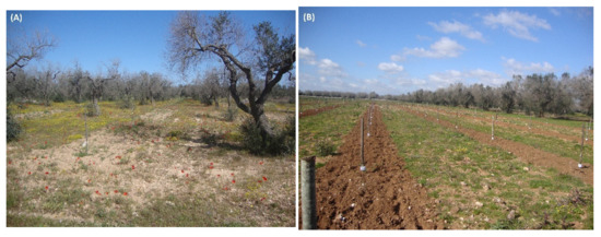 Situation in early autumn 2017 at San Pietro Vernotico (Brindisi province) after the eradication of about 900 olive trees that surrounded eight olive trees infected by Xylella fastidiosa subsp. pauca, carried out during autumn 2015. The trees in the figure were left in place at the border of the eradication area (in the background) since they were more than 100 m away from the infection front. In early autumn 2017, all the remaining trees resulted symptomatic and positive for X. f. subsp. pauca. The spontaneous plants not eliminated during the eradication could have acted jointly as a “reservoir” for the possible vector activity in the area for the further pathogen spread in the area.