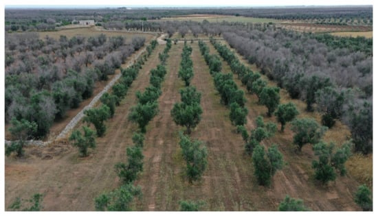 Olive grove trained with the local cultivars Ogliarola salentina and Cellina di Nardò at Cannole (Lecce province) (in the middle) that applies the control strategy toward Xylella fastidiosa subsp. pauca. Note the “drift effect” of the treatments on the bordering withered trees.