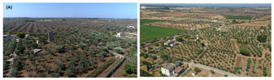 Neighboring olive groves at Nardò (Lecce province). In panel (A), during June 2019, the olive grove in the lower part of the image had the control strategy applied and the trees appear healthy, whereas the olive grove in upper part of the image had cultivation abandoned and the trees appear completely withered. Panel (B) shows the situation in June 2022. The olive grove that has continued to apply the control strategy (lower part of the image) still continues to produce oil with the local cultivars, whereas the neighboring farm replaced olive trees with tomato (on the left). In the background, other olive groves appear completely withered.