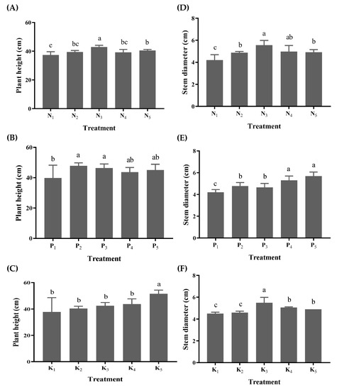 The plant height and stem diameter of lettuce under different application rates of N, P, and K. The lettuce plants were treated with five levels of N, P, and K fertilizers. Then, the plant height (A–C) and stem diameter (D–F) under N (A,D), P (B,E), and K (C,F) treatments were measured and recorded. Different letters indicate the distinct differences at p < 0.05.