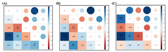 Correlation coefficient among N (A), P (B), and K (C) application rates and the four quality traits. NC, Nitrate concentration; VC, Vitamin C concentration; PC, Soluble protein concentration; SS, Soluble sugar concentration; NAR, N application rate; PAR, P application rate; and KAR, K application rate. * p < 0.05, *** p < 0.001.