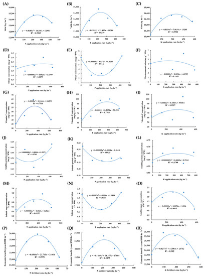 The models for fertilizer response of different lettuce traits under the varied nutrient application amounts. (A–C), yield; (D–F), nitrate concentration; (G–I), vitamin C concentration; (J–L), soluble protein concentration; (M–O), soluble sugar concentration; and (P–R), Economic benefit. FW, fresh weight.