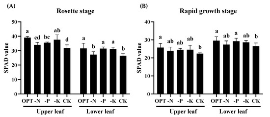 Effects of N, P, and K balanced fertilization on SPAD values of different leaves at two growth stages of lettuce. SPAD values of the upper and lower leaves were measured at both rosette stage (A) and rapid growth stage (B). Different letters indicate the distinct differences at p < 0.05.