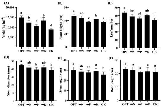 Effects of N, P, and K balanced fertilization on lettuce yield and other agronomic traits. (A) Yield; (B) Plant height; (C) Leaf number; (D) Stem diameter; (E) Stem length; and (F) Root length. Different letters indicate the distinct differences at p < 0.05.