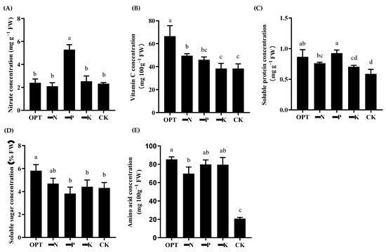 Effects of N, P, and K balanced fertilization on quality of lettuce. (A) Nitrate concentration; (B) Vitamin C concentration; (C) Soluble protein concentration; (D) Soluble sugar concentration; and (E) Amino acid concentration. Different letters indicate the distinct differences at p < 0.05.