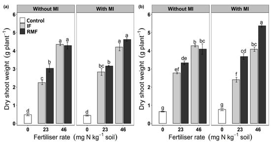 At both growth stages, shoot dry weight was affected by the significant three-way interaction fertiliser type × fertiliser rate × MI (p = 0.042 at anthesis and p ≤ 0.001 at maturity) (Table 1). At anthesis, the interaction effect was because of greater shoot dry weight in RMF than IF at 23 mg N kg−1 soil without MI, with no fertiliser type differences with MI inoculation (Figure 2a). At maturity, the interaction effect was observed because of the higher shoot dry weight in RMF than IF at 23 and 46 mg N kg−1 soil with (but not without) MI (Figure 2b).