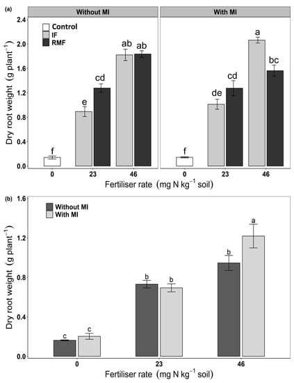 The dry root weight was significantly affected by the interaction effect of fertiliser type × fertiliser rate × MI (p = 0.032) at anthesis and fertiliser rate × MI (p = 0.041) at maturity (Table 1). At anthesis stage, the interaction effect was observed because of dry root weight being higher in IF than RMF at 46 mg N kg−1 soil treated with MI (Figure 3a) and higher in RMF than IF at 23 mg N kg−1 soil without MI. By contrast, at maturity, the interaction effect of Fr × MI was observed due to increased root biomass of plants treated with than without MI at 46 mg N kg−1 soil, but not at 0 and 23 mg N kg−1 soil (Figure 3b).