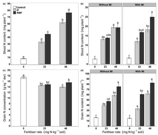 At anthesis, the main effects of fertiliser rate (p ≤ 0.001) and MI (p = 0.014) were significant for shoot N concentration, and the interaction effect of fertiliser type × fertiliser rate (p ≤ 0.001) was significant for shoot N content (Table 1 and Table 2). At anthesis stage, the shoot N concentration was higher in plants treated with 0 and 46 mg N kg−1 than 23 mg N kg−1 soil, and there was no difference between 0 and 46 mg N kg−1 (Table 2). The shoot N concentration was higher in plants treated with than without MI (Table 2). The interaction effect was significant because of the increase in shoot N content was greater with increasing fertilisation rate in the case of RMF than IF (Figure 4a).