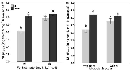 Shoot N uptake efficiency (NUpEshoot) as influenced by the effect of (a) fertiliser type (Ft) × fertiliser rate (Fr) (mean ± SE, n = 8), and (b) Ft × microbial inoculant (MI) (mean ± SE, n = 8). In (a) and (b) separately, mean values followed by the same letter are not statistically different as per Tukey’s HSD test at p ≤ 0.05. Three-way ANOVA (Table 1) showed significant interaction of Ft × Fr (p = 0.005) and Ft × MI (p = 0.006) on NUpEshoot. IF, inorganic fertiliser; RMF, rock mineral fertiliser.