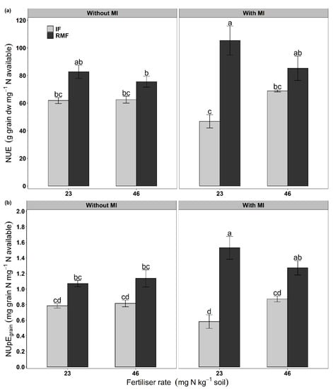 We hypothesised that RMF combined with MI would be more effective in improving wheat growth, grain yield, NUE, GPC and GPY than IF. However, we observed that the combined application of RMF and MI was positive for shoot growth, shoot N content at maturity, grain N content, NUE and GPY, but root growth, grain yield and GPC were influenced mainly by RMF alone than IF regardless of MI. These findings are supported by other studies where slow-release fertiliser can attain the similar or even higher yield when used in relatively lower quantities than conventional fertiliser [,] and also increases NUE [].
