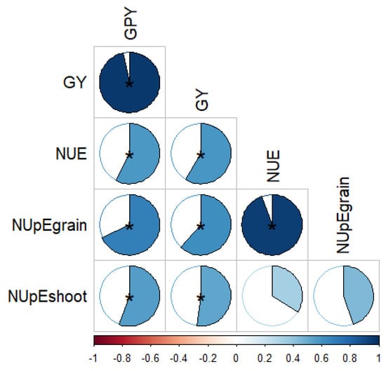 Correlation coefficients of different N-use efficiency indices with grain yield and grain protein yield. The shaded circle area shows the absolute value of the corresponding correlation coefficients. All the relationships were positive. An asterisk (*) indicates the significance at p < 0.01. GY, grain yield; GPY, grain protein yield; NUpEshoot, Shoot N uptake efficiency; NUE, N-use efficiency; NUpEgrain, grain N uptake efficiency.