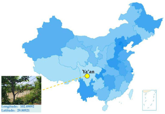 Hanyuan County, Ya’an City, Sichuan Province, is one of the areas where sweet cherries are grown in China, and has the reputation of being the “hometown of sweet cherries in China”. The planting area of sweet cherries has reached more than 42 square kilometers, with a production of 20,000 tons, and more than 30 varieties of sweet cherries have been introduced and promoted from early to late maturity. Hanyuan has become the largest cultivated area in Sichuan Province and even in the southwest region, and has been listed by the Sichuan Provincial Department of Agriculture as “Sichuan Province advantageous characteristic benefit agriculture sweet cherry base”. The map of the location of the sweet cherry orchard is shown in Figure 1.