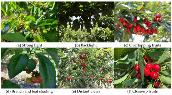We collected high-resolution images of immature, semi-ripe, and ripe sweet cherries of the Red Lantern variety from April 2021 to June 2021 at sweet cherry growing sites in Hanyuan County. To improve the robustness and generalization of the network, a 5184 × 3456-pixel Canon EOS60D SLR camera, a 12-megapixel Apple phone, and a 12-megapixel Samsung phone were used to capture the images. All images were taken in natural light, while some images were taken of sweet cherries in complex environments such as light changes, fruit shading, fruit overlap, fruit close up, and plant far away, as shown in Figure 2. The shooting time was 10–12 a.m. and 1–4 p.m. Ultimately, 800 images of each of the three types of sweet cherries were collected, totaling 2400 images with a maximum resolution of 5184 × 3456 pixels, and stored in JPG format.