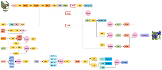 Backbone: The backbone side mainly includes Focus, CSP_1, and Spatial Pyramid Pooling (SPP) structures, and the SiLU function is used in the activation function. Among them, there are two branches of the CSP_1 module, the input features will enter into two branches separately and perform different operations, then the features inputted from two branches will be Concat and the results will be sent to the Convolution + Batch Normalization + SiLU (CBS) block.