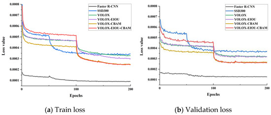 Since the loss function can accurately reflect the convergence of the model during the training process of the network, in this paper, the loss function curves of six network models are compared and analyzed, as shown in Figure 7. Figure 7a shows the loss curve of the training set, and Figure 7b shows the loss curve of the validation set. It can be seen that the training loss curve and validation loss curve of the improved YOLOX-EIoU-CBAM model both showed a decreasing trend as the number of iterations increases and the training and validation losses were close to each other when the model iterated 192 times. When the model reached 197 iterations, the training loss showed a slightly decreasing trend, while the validation loss remained stable, but overall, they were close to each other, indicating a slight degree of overfitting in the proposed method. In general, compared with Faster R-CNN, SSD, YOLOX, YOLOX-EIoU, YOLOX-CBAM, and the base YOLOX model, the YOLOX-EIoU-CBAM model had a faster and more accurate reduction in loss values during training and validation.