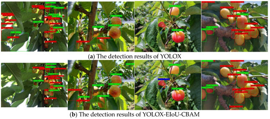 The results of the base YOLOX and the improved YOLOX-EIoU-CBAM for the detection of sweet cherry fruit are shown in Figure 8. As can be seen from the figure, the original YOLOX model had certain problems of missing and misdetection for sample pictures in complex orchard backgrounds. For example, in the first picture in Figure 8a below, the YOLOX model identified the leaves as fruits. In the second image in Figure 8a, the YOLOX model did not identify the sweet cherry ripeness category obscured by the leaves in the lower left corner of the image. In the third image of Figure 8a, the YOLOX model did not identify the fruit obscured by the leaves in the middle of the picture. In the last picture of Figure 8a, the YOLOX model did not accurately identify the overlapped fruit in the upper left corner of the picture and missed the fruit located at the lower edge position in the middle of the picture. In contrast, the improved YOLOX-EIoU-CBAM effectively improves the model’s ability to detect the ripeness of sweet cherry fruits by modifying the bounding box loss function and embedding CBAM layers in the backbone and neck networks of the YOLO model (see the first and second pictures of Figure 8b), and is able to accurately detect fruits in the case of overlapping fruits (see the fourth picture of Figure 8b), and shows friendly detection ability for fruits in the corners of the pictures (see the fourth panel of Figure 8b).