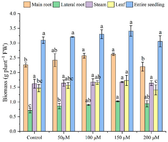 Effects of exogenous melatonin on tea seedling biomass under Cd stress. The data represent means ± standard deviations for three replicates. Different letters indicate groups that are significantly different at p < 0.05.