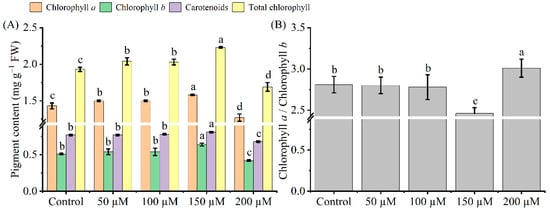 Only the 150 μM melatonin treatment significantly increased chlorophyll a, chlorophyll b, total chlorophyll, and carotenoid content in Cd-stressed tea seedling leaves (Figure 2). When treated with 150 μM melatonin, the chlorophyll a, chlorophyll b, carotenoid, and total chlorophyll content increased by 10, 25, 5, and 16%, respectively (p < 0.05). However, the chlorophyll a, chlorophyll b, carotenoid, and total chlorophyll content was the lowest at an exogenous melatonin concentration of 200 μM, which decreased by 11, 18, 12, and 12%, respectively. Interestingly, only 200 μM melatonin increased chlorophyll a/b, while the other concentrations contrasted with this.