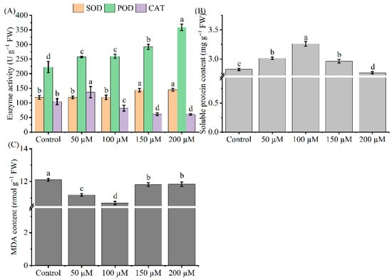 We evaluated the influence of melatonin by investigating changes in the antioxidant systems, soluble protein, and malondialdehyde (MDA) in melatonin-treated Cd-stressed tea seedling leaves. The activities of SOD (EC 1.15.1.1) and POD (EC 1.11.1.7) significantly increased due to different melatonin concentrations, both of which reached a maximum level at 200 μM melatonin, and increased by 22 and 61%, respectively (p < 0.05, Figure 3). Furthermore, the highest CAT (EC 1.11.1.6) value was recorded in the 50 μM melatonin group, which increased significantly by 31% (p < 0.05). Except for the 200 μM melatonin concentration, the soluble protein content of the other treatments increased (Figure 3A). Moreover, the highest soluble protein level occurred at 100 μM, and further increased by 16% (Figure 3B). Additionally, melatonin decreased the tea seedling leaf MDA content, and the lowest value was observed at 100 μM melatonin, which decreased by 12% (Figure 3C). These results imply that melatonin is effective in adjusting antioxidant enzyme activities and soluble protein content to alleviate Cd-induced toxicity.
